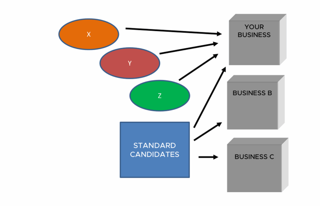 Considering other candidate pools takes hiring out of a small box, opens up a whole new world of applicants (see X,Y and Z in diagram below) and gives a company a real competitive edge. While other businesses are still vying for conventional recruits, an organisation can fill all its positions with applicants its rivals have never even considered. Even better, because these people have been given a new and unlooked-for opportunity in their lives, they tend to be grateful, positive, loyal and committed to excellence to justify this uncommon belief in them.